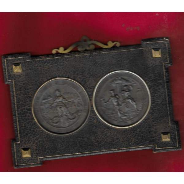 Marco expositor de la epoca realizado por la gran fábrica de bisuteria y esmaltes Francisco Sala de Madrid con medalla doblada -mostrando anverso y reverso - de la inauguración del trayecto Villanueva Barcelona 29 diciembre 1881. Reverso Compañia de ferrocarriles directos de Madrid y Zaragoza a Barcelona